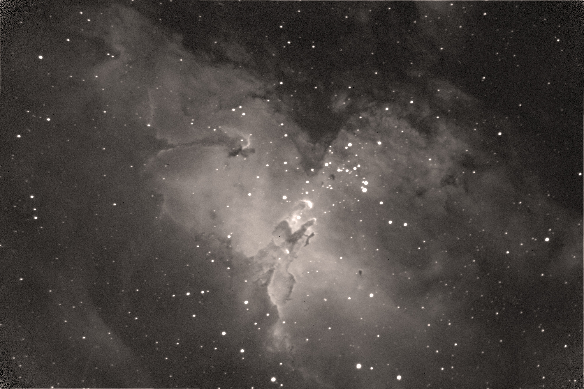 The Eagle Nebula (catalogued as Messier 16 or M16, and as NGC 6611) is a young open cluster of stars in the constellation Serpens, discovered by Jean-Philippe de Cheseaux in 1745-46. Its name derives from its shape which resembles an eagle.