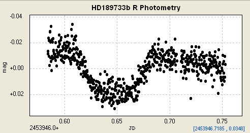 The exosolar planet HD189733b was detected in Oct. 2005 using radial velocity measurement by F. Bouchy at the Haute-Provence Obs. in France.  The planet has an orbital period of 2.219 days and a mass of 1.15 Jupiters.  The parent star, HD189733, has a mass of 0.82 Msun and is a spectral class G5; very similar in color and mass to our own Sun.  HD189733 is located in the constellation Velpecula approx. 60 light years from Earth.   The graph below plots the brightness [magnitude] of the star over the course of 4.8 hours.  As the exosolar planet passed between its parent star and Earth, its shadow diminished the magnitude of the star by a factor of ~0.4%   The ingress and egress angles of the light curve can be used to project the diameter of the exosolar planet.