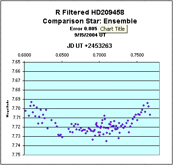 The author was able to detect the transit of the planet in front of the star in R band photometry on Sept. 15, 2004.  Over 500 images were taken and the average photometric magnitude was calculated for groups of 5 images [boxcar averaging].  A graph of the R band magnitude vs. time is shown below.