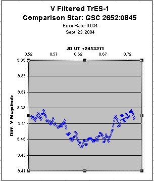 The author was able to detect the transit of the planet in front of the star by V band photometry on Sept. 22, 2004.  Over 200 images were taken and the average photometric magnitude was calculated for groups of 5 images [boxcar averaging].  A graph of the V band magnitude vs. time is shown below.