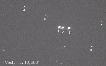 Composite Image of 4 Vesta taken by author on Nov 10, 2001. Imaged using  ST-6B on the C-14 at f/6.3 .  60 Sec exposures through Ha filter