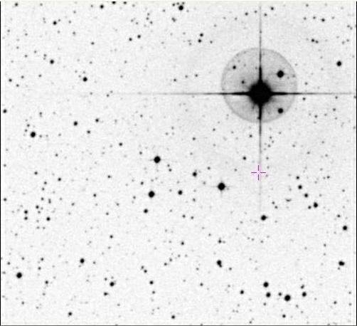This image was taken at June 08 0500 UT.  The indicated object is Pluto.  Pluto has an angular diameter of about 0.14 arcsec.  North is down.