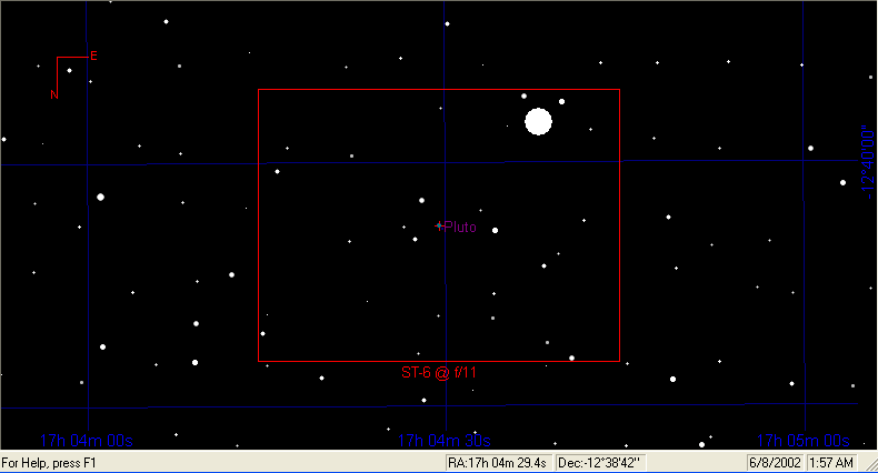 Pluto TheSky.gif (6951 bytes) TheSky screen shot showing the position of Pluto on June 08, 2002 at ~0500 UT.  At the time that these images were taken, Pluto had  a magnitude of ~ 9.5