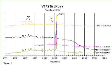 Figure 1 shows four spectra of V475 Sct taken over a 38-day period.  The most prominent feature of these spectra is the Hydrogen alpha [H alpha] peak located at 6563Å.   This peak is caused by the ionization of the hydrogen on the white dwarf's outer surface.  The heat and the resultant explosion caused by the hydrogen fusion reaction push the ionized hydrogen gas away from the star's surface.  Small amounts of higher atomic weight elements from the star's surface are carried along with the expanding hydrogen gas.  Notice that as time progresses the width of the H alpha peak increases slightly.  The importance of this observation will be addressed later in the paper