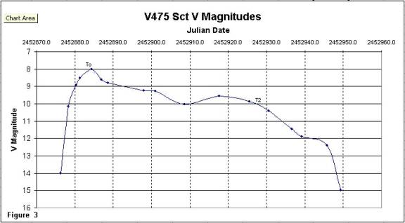 Where Mv equals the absolute V band magnitude of the nova and t2 is the time in days for the nova to drop exactly two magnitudes in brightness in the V band.  In the case of V475 Sct, the t2 time was 25 days.  Therefore, the absolute V magnitude of the nova is calculated to be -7.66.